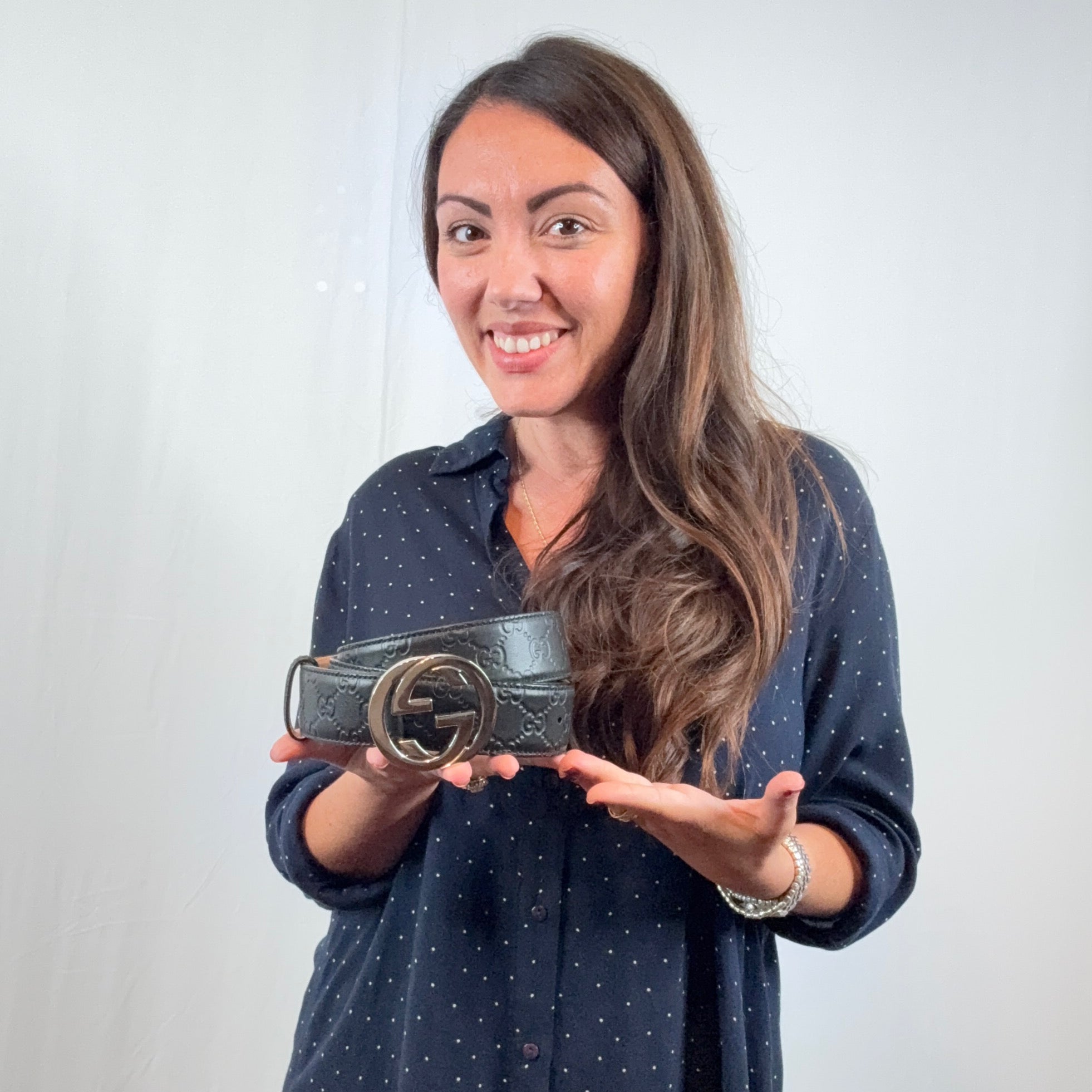 Cintura Gucci in pelle nera con monogramma Guccissima e fibbia GG, taglia 115/46